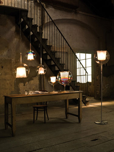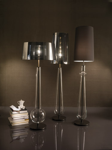 Светильник с корпусом из матового, цвета антрацита, никелированного и дутого стекла в следующих цветах: прозрачный, дымчатый или янтарном. Выпускается также в золотой или серебряной фольге.